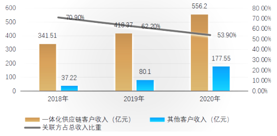 2020年一體化供應(yīng)鏈客戶貢獻(xiàn)營收比重達(dá)75.8%,相比2018年的90%下降了近16個(gè)百分點(diǎn)。