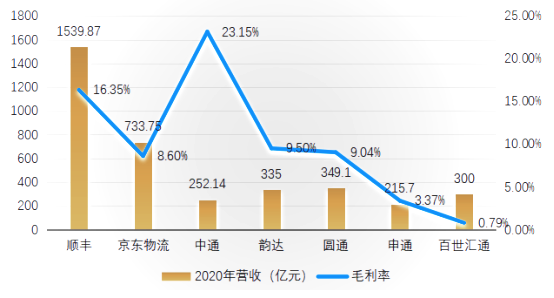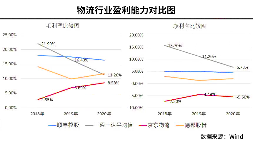 對(duì)比國內(nèi)老對(duì)手順豐、菜鳥、四通一達(dá)等上市物流公司,京東物流近三年毛利率雖一直呈上漲趨勢(shì),從2018年的2.85%增至2019年的6.89%,到了2020年,毛利率漲至8.6%,但還是僅處于行業(yè)腰部水準(zhǔn),低于中通、順豐等10%以上的毛利率。京東物流凈利率連續(xù)三年都處于掉隊(duì)狀態(tài)。