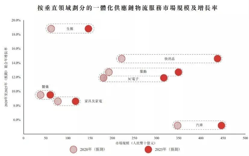 從增長(zhǎng)率來看,2020年至2025年,生鮮、快消品及服飾的一體化供應(yīng)鏈物流支出增長(zhǎng)率領(lǐng)先,分別為18.8%、14.6%及12.7%。當(dāng)然,其他領(lǐng)域需求總量也不低,到2025年,汽車行業(yè)、3C電子、家具及家電行業(yè)、醫(yī)藥行業(yè)對(duì)一體化供應(yīng)鏈物流服務(wù)的需求,將分別增至4460億元、3160億元、1170億元和600億元。