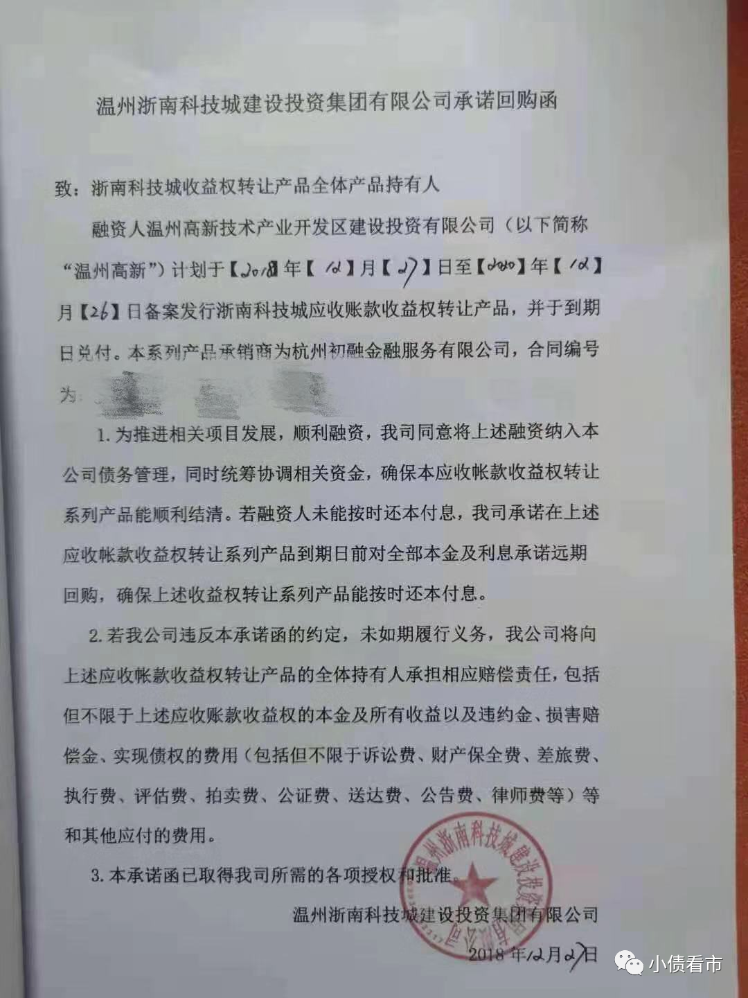《小債看市》注意到,《浙南科技城建設投資集團有限公司承諾回購函》中顯示,浙南科技城投資集團將上述融資納入公司債務管理,同時統籌協調相關資金,確保本應收賬款收益權轉讓系列產品順利結清。