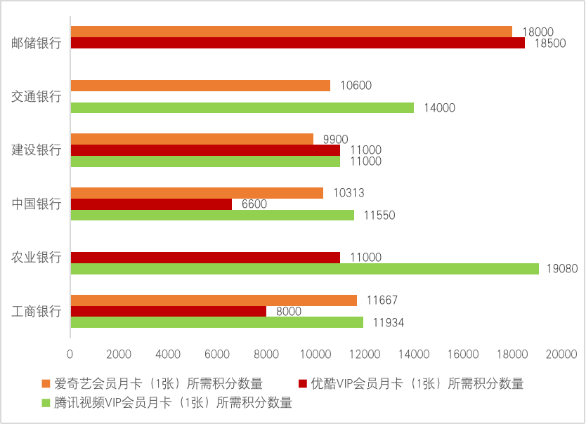 在積分兌換環節,各家銀行信用卡的積分壁壘并未打破,價值分化明顯。以部分視頻類會員卡兌換權益為例,在國有六大行中,用積分全額兌換騰訊視頻VIP會員月卡、愛奇藝會員月卡、優酷會員月卡,建設銀行兌換前兩種視頻月卡權益所需積分最少(積分含金量最高),中國銀行兌換第三種月卡權益,所需積分最少。兌換同樣的權益,對應的每家銀行積分數量價值存在“積分差”。