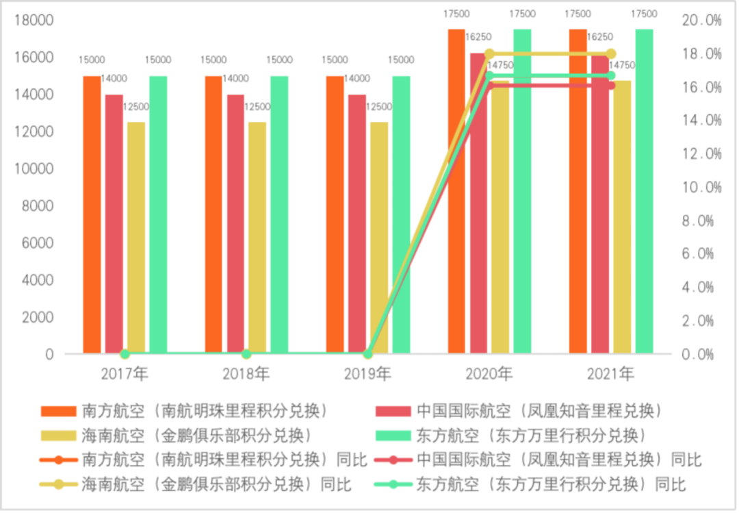 以中國銀行積分兌換航空里程為例。從2017年到2021年,中國銀行與國內各家航空公司的里程積分兌換比例出現調整,積分價值下滑趨勢明顯。其中2020年中國銀行積分兌換南方航空、中國國際航空、海南航空、東方航空1航空里程所需積分數量均出現超過10%的增長,特別是2020年中國銀行積分兌換1航空里程海南金鵬俱樂部積分所需積分數量同比增長率達到18%。