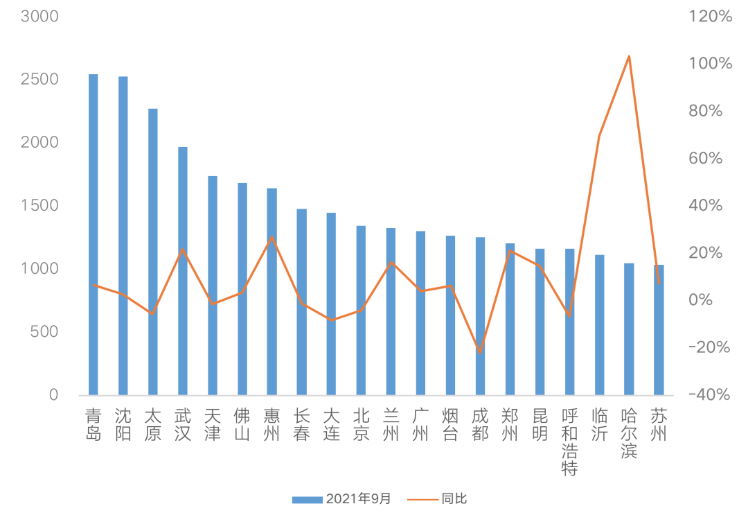 二線城市中,北部?jī)?nèi)陸城市諸如沈陽(yáng)、青島、太原9月末狹義庫(kù)存量均超2000萬(wàn)平方米,位列本月末狹義庫(kù)存總量TOP3。同比來看,漲跌參半,漲幅超20%的主要是北部和中部等弱二線城市,鄭州、武漢、銀川、哈爾濱、南昌等,庫(kù)存積壓情況顯著。