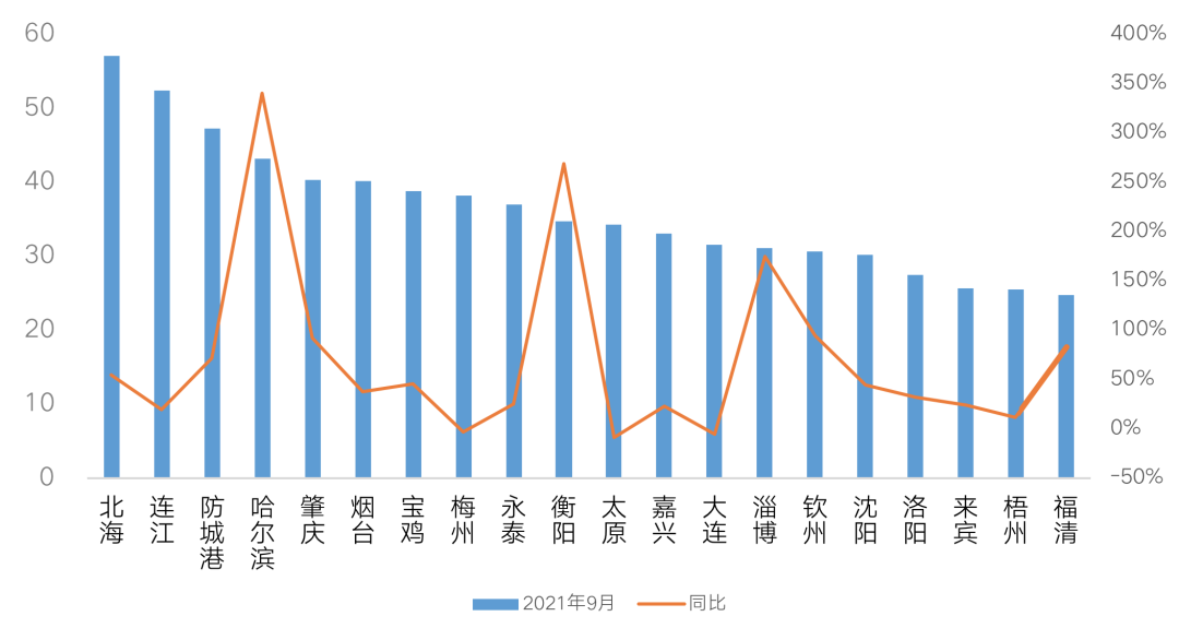 2021年9月末,廣義庫(kù)存達(dá)到37.8億平方米,環(huán)比微降0.5%,同比上漲10%。市場(chǎng)下行壓力下,狹義庫(kù)存同環(huán)比齊增,廣義庫(kù)存微降與房企開工意愿回升密切相關(guān),從統(tǒng)計(jì)局?jǐn)?shù)據(jù)來看,9月單月房屋新開工面積為17442萬(wàn)平,環(huán)比上漲5%,可見與搶收業(yè)績(jī)相比,房企更傾向于抓回款,逐步加快開工進(jìn)度,以保證年內(nèi)資金流回正。