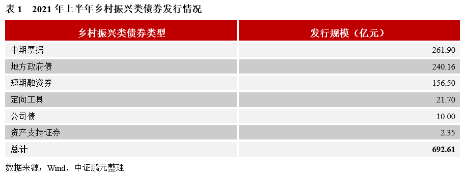 今年以來至2021年6月31日,債券市場鄉村振興類債券共發行692.61億元。從債券類型看,涵蓋了中期票據、地方政府債、短期融資券、定向工具、公司債和資產支持證券。其中,鄉村振興中期票據發行規模最大,為261.90億元,接下來是鄉村振興地方政府債(240.16億元)、鄉村振興短期融資券(156.50億元),其他類型發行量較少。