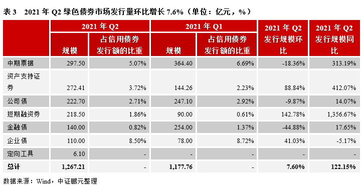 碳中和債角度,2021年Q2碳中和債發行量與Q1相比,有所下降。分債券品種看,碳中和資產支持證券發行規模有所增長,其余碳中和債券品種均有所下降。從碳中和債發行量占綠色債發行量的比重看,各品種碳中和貼標的積極性均有所下降,短期融資券碳中和貼標的積極性下降最明顯,或許是出于成本考慮,碳中和債券需要第三方機構的評估認證。