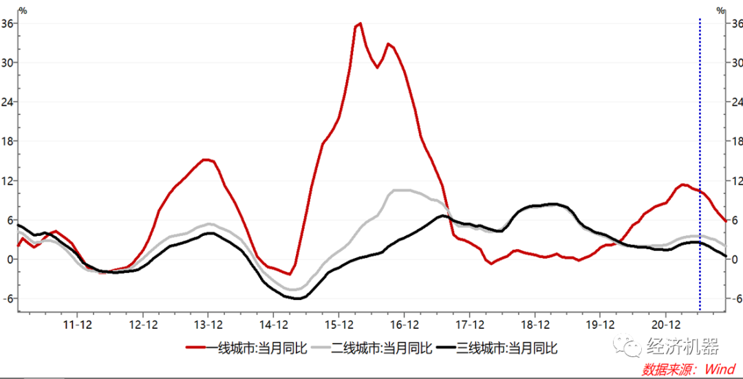 房地產方面,房地產銷售面積當月同比增速從6月底的7.5%,大幅下降至11月份的-14%,房地產行業(yè)幾乎“一夜入冬”。房地產下滑有周期性原因,2015-2020年,房地產行業(yè)呈現(xiàn)復蘇和分化走勢,行業(yè)自身存在調整性需求。2021年下半年以來,供需兩端多種因素疊加下,房地產行業(yè)出現(xiàn)了同步的下行(圖1)。