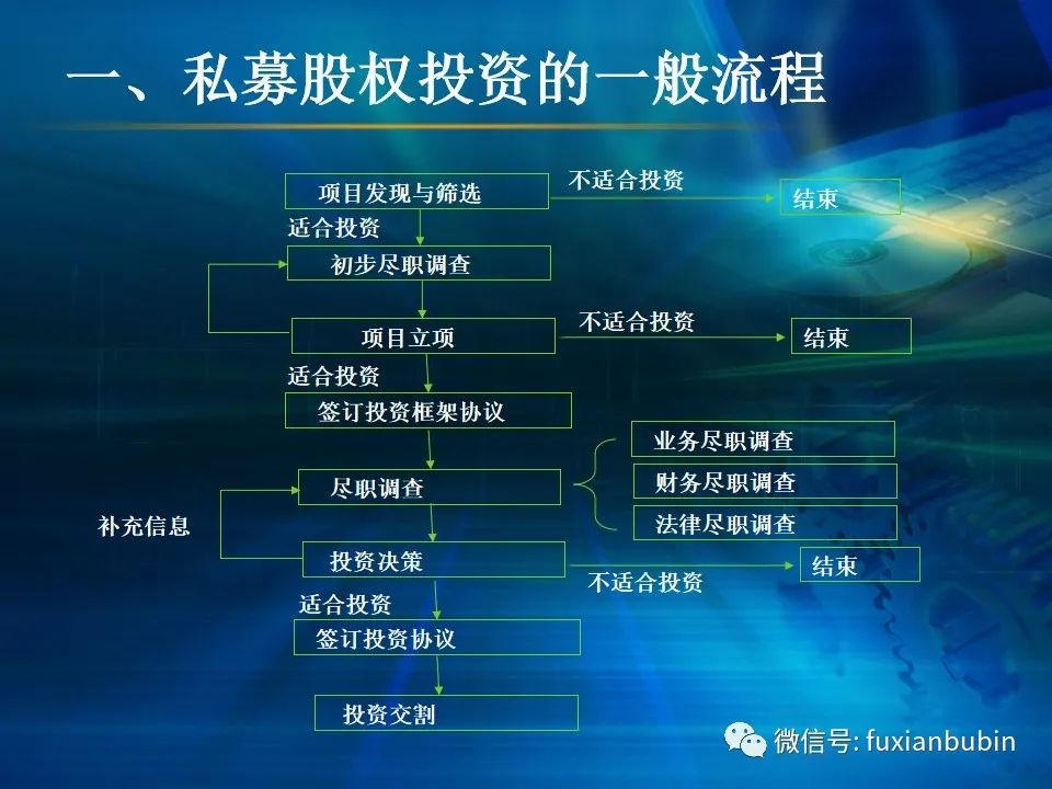 私募股權投資基金的投資工作,其業務流程主要圍繞投資決策開展,通常包括項目開發與篩選,初步盡職調查,項目立項、簽訂框架投資協議、盡職調查、投資決策、簽署投資協議、投資交割等主要環節。在這一過程中,財務盡調主要關注目標公司的歷史財務業績的情況,并對未來財務狀況進行合理預測。調查內容包括企業的歷史經營業績,未來盈利預測、營運資金、融資結構、資本性開支以及財務風險敏感度分析等。其作用在于為投資及整合方案設計、交易談判、投資決策提供支撐,進而判斷投資是否符合戰略目標及投資原則。法律盡職調查是對相關法律事務具有法律意義的背景資料進行應有的調查,使相關法律事務的處理建立在客觀、全面的信息基礎之上,以確保相關法律事務的處理能夠達到預期的結果,而不因相關信息在真實性、完整性、全面性、合法性等方面的原因影響預期目標的實現。經過財務盡調與法律盡調,在股權投資之前,需要考慮該項投資的性質、事實和背景,為之選擇恰當的估值方法,并結合市場參與者的假設,采用合理的市場數據和參數對目標公司進行估值,明確目標公司的公允價值。