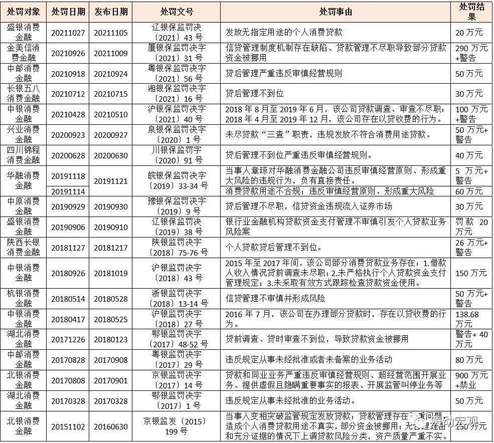 目前針對消費金融公司的監(jiān)管處罰案例已比較多,處罰事由多為違反審慎經(jīng)營規(guī)則、違反發(fā)放不符合用途的個人消費貸款等等。不過從處罰結(jié)果來看,超過100萬元的罰款案例并不多,因此在消費金融行業(yè)中,一旦處罰案例超過100萬元,則大概能說明該處罰和相應的違規(guī)問題算是比較重了。