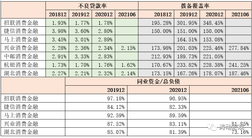 以2020年底為例,招聯(lián)消費金融、捷信消費金融、馬上消費金融、興業(yè)消費金融、中郵消費金融的不良貸款率分別達到1.78%、2.80%、2.89%、2.34%和2.83%,對應的撥備覆蓋率分別為348.45%、150%、153.08%、225.46%和221.05%。