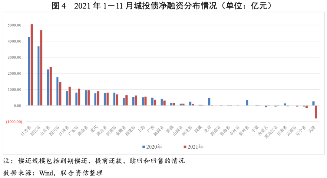 城投債發行規模保持增長,但凈融資區域性分化進一步加劇,江蘇、浙江、山東等地城投債凈融資規模保持增長