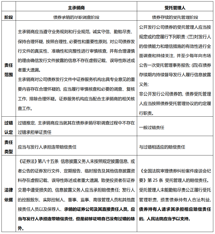 所謂能力越大, 責任越重, 中介機構在債券發行和存續中的身份和職責不同, 其過錯認定和責任承擔的方式也隨之不同。而其中最易混淆的是就是券商在債券承銷和存續階段的雙重身份: