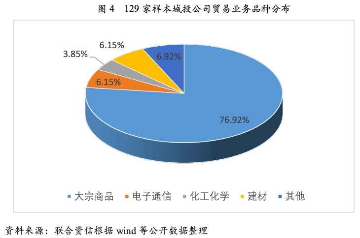 貿(mào)易品種方面,上述129家樣本企業(yè)中,大宗商品貿(mào)易為最主要貿(mào)易品種(占76.92%),其次為電子通信和建材,占比均為6.15%。大宗商品作為城投企業(yè)貿(mào)易業(yè)務(wù)的主要品種,主要特點為交易規(guī)模大、價格相對透明、產(chǎn)品標準化程度高、容易轉(zhuǎn)手成交,但若未能與下上游鎖定價格,也將面臨著大宗商品價格大幅波動的相關(guān)風(fēng)險。建材業(yè)務(wù)方面,由于城投公司本身也參與城市基礎(chǔ)設(shè)施建設(shè)業(yè)務(wù),涉及建材貿(mào)易存在一定的業(yè)務(wù)協(xié)同性和合理性。電子通信貿(mào)易方面,部分貿(mào)易業(yè)務(wù)與2021年爆出的專網(wǎng)通信貿(mào)易風(fēng)險事件有直接關(guān)聯(lián),具有很強的區(qū)域性特點,電子通信產(chǎn)品與大宗商品和建材不同,下游客戶特定或有限,一旦下游客戶出現(xiàn)問題,很難像標準化的大宗商品及建材一樣,能夠迅速轉(zhuǎn)賣回籠資金。
