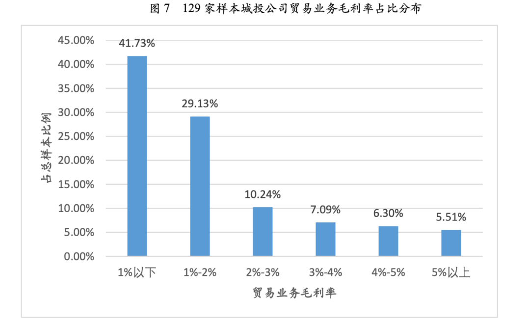 貿(mào)易業(yè)務(wù)毛利率方面,129家城投公司中,41.73%的城投公司貿(mào)易業(yè)務(wù)毛利率不足1%,貿(mào)易業(yè)務(wù)毛利率超過5%的僅占樣本總量的5.51%,城投公司貿(mào)易業(yè)務(wù)毛利率普遍較低。