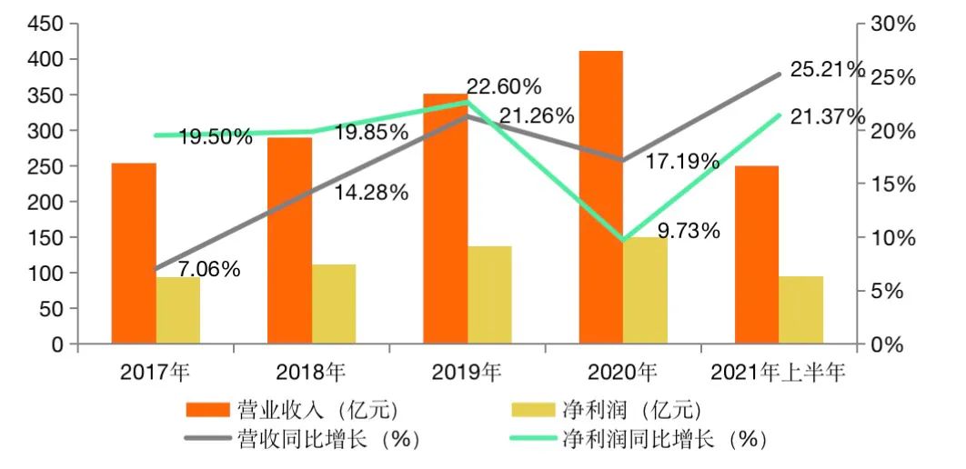 圖 2:2017年-2021年上半年寧波銀行營業收入