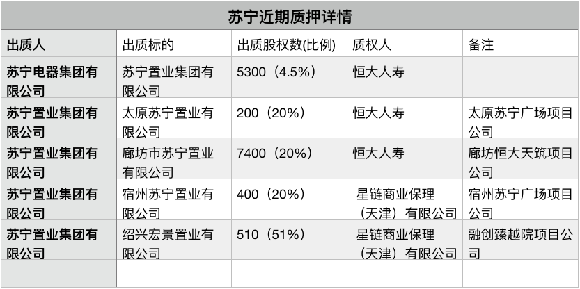 同時,蘇寧置業(yè)也將太原蘇寧置業(yè)、廊坊蘇寧置業(yè)20%的股權(quán)質(zhì)押給恒大人壽,這兩家公司擁有正在開發(fā)中蘇寧廣場。