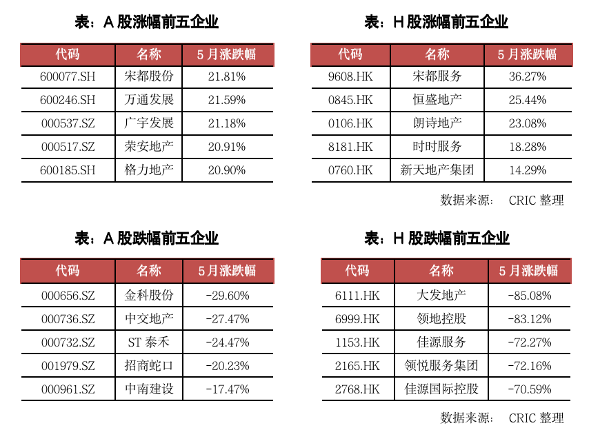 本月兩市的地產相關股表現都較為一般。A股地產股整月上漲的股票占比為56%,而H股整月上漲的股票占比則僅為26%。在H股方面,本月宋都服務的月漲幅達到了36.27%,是H股漲幅最大的地產相關股。企業從5月4日開始連續大漲,在11日甚至達到了近20%的漲幅,奠定了整月漲幅的基礎,此后雖然股價略有波動,但是整月最終的漲幅仍然達到了36.27%。