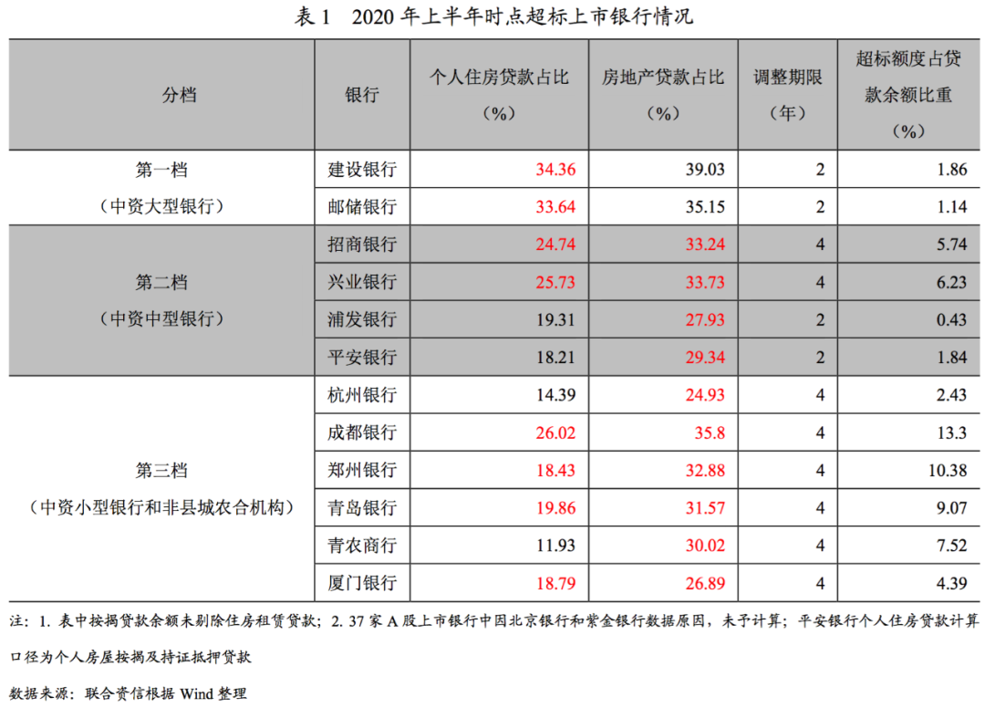 根據(jù)35家國(guó)內(nèi)上市銀行2020年半年報(bào)經(jīng)營(yíng)數(shù)據(jù)計(jì)算,有12家銀行超出監(jiān)管上限(詳見(jiàn)表1),其中第一檔銀行中,建設(shè)銀行和郵儲(chǔ)銀行個(gè)人住房貸款占比超出監(jiān)管上限均在2pct以內(nèi),有兩年調(diào)整過(guò)渡期;第二檔銀行中,招商銀行和興業(yè)銀行個(gè)人住房貸款占比及房地產(chǎn)貸款占比超出監(jiān)管上限均在2pct以上,有四年調(diào)整過(guò)渡期,浦發(fā)銀行和平安銀行房地產(chǎn)貸款占比超出監(jiān)管上限在2pct以內(nèi),有兩年過(guò)渡期;第三檔銀行中,杭州銀行、成都銀行、鄭州銀行、青島銀行、青農(nóng)商行以及廈門銀行均不同程度超出監(jiān)管上限,第四檔中無(wú)上市銀行超標(biāo)。銀行在2020年下半年發(fā)放按揭貸款規(guī)模較大,以2020年末時(shí)點(diǎn)計(jì)算的超上限銀行個(gè)數(shù)可能會(huì)增加。